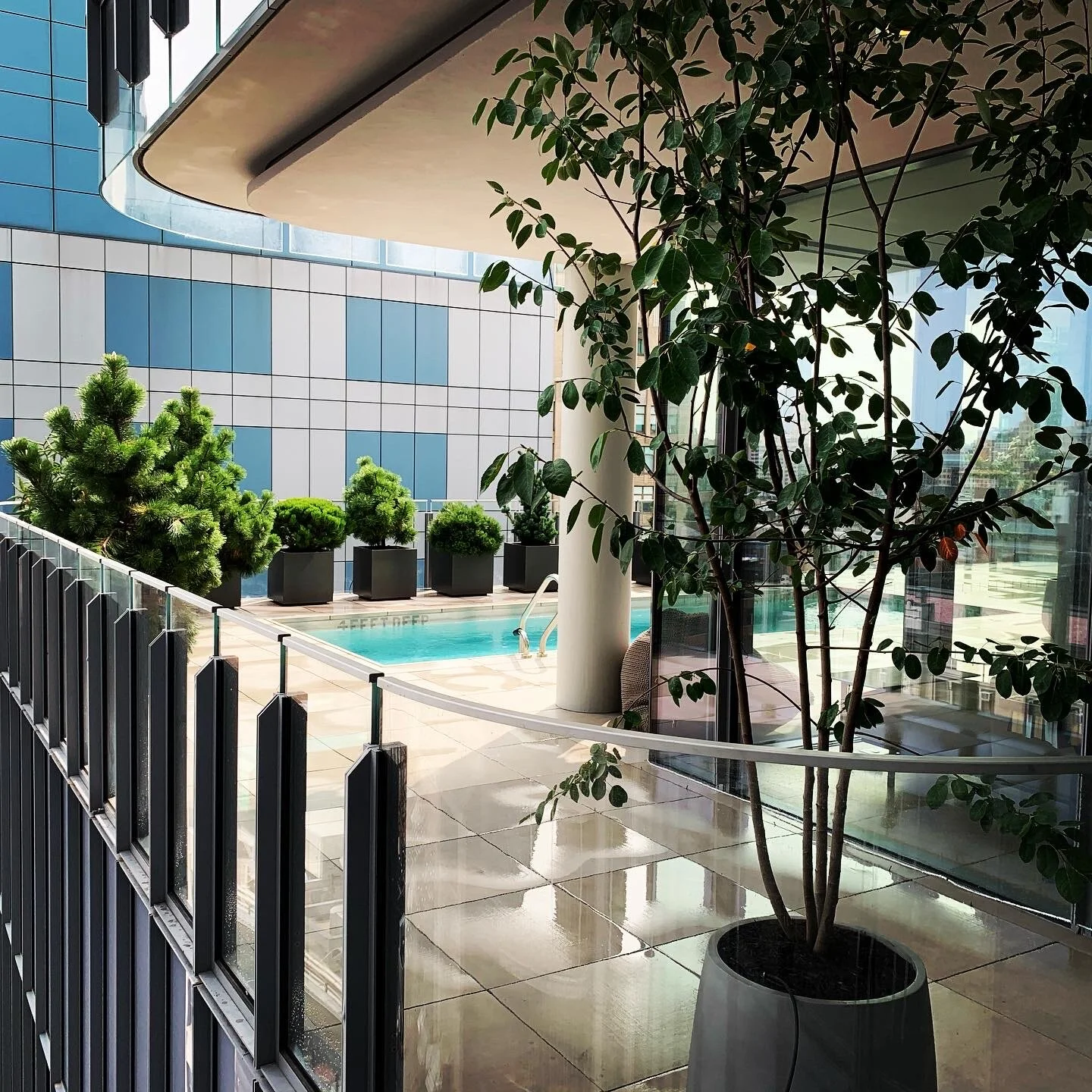 Luxury terrace with eclectic evergreen plantings.